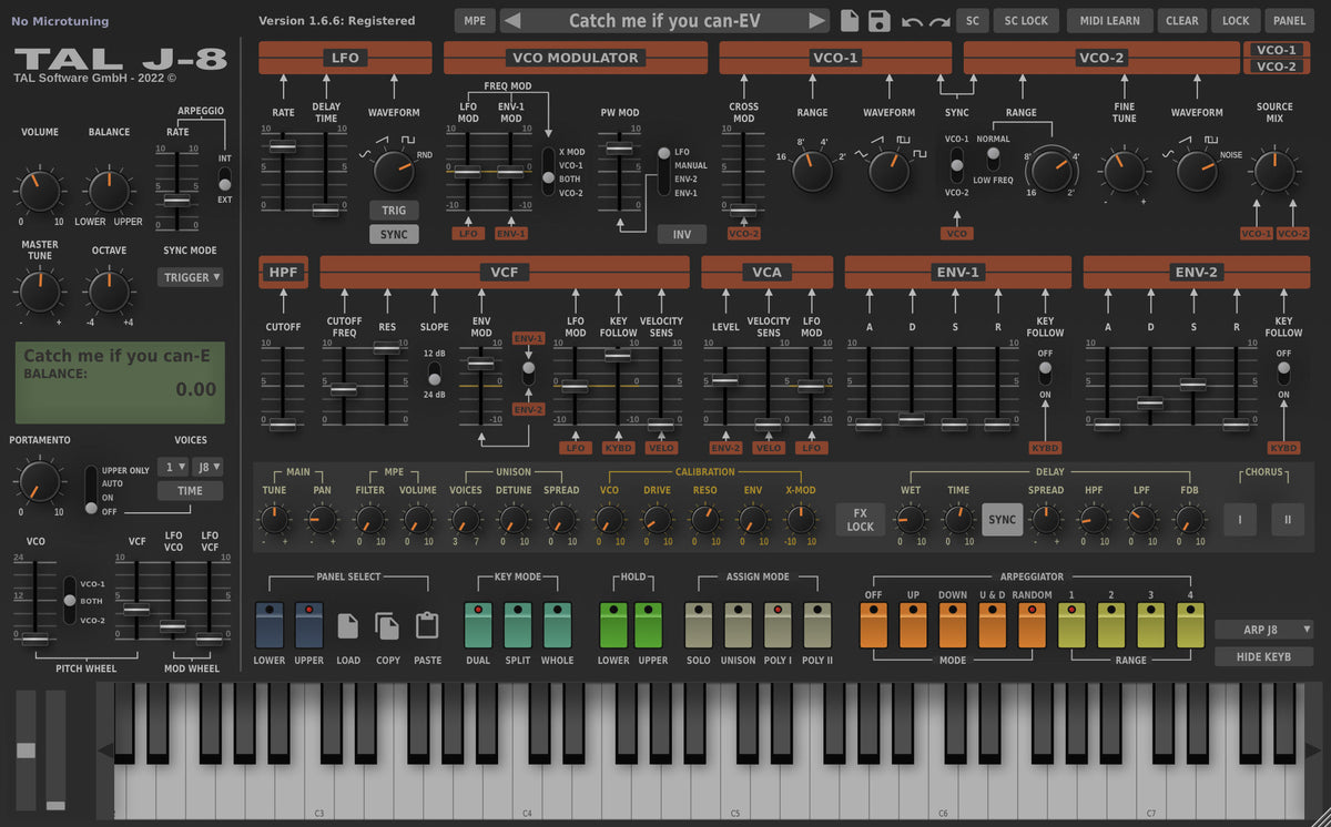 TAL-J-8 is a faithful replica of the renowned 80s hardware synthesizer, meticulously calibrated based on TAL's own Jupiter 8 unit. It produces real-time synthesized sounds, without relying on any pre-recorded samples. With infinite modulation possibilities akin to the hardware, it also includes convenient features such as a calibration section to push the filter to its limits.